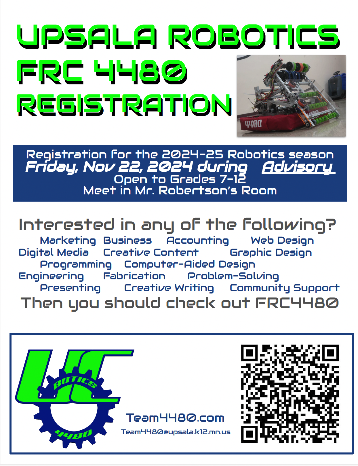 The FRC Team 4480 Registrations are beginning for the 2025 season. Our team is hosting an informational meeting during Advisory on Friday November 22, 2024. See the attached Poster for information, and the QR code is to register online!